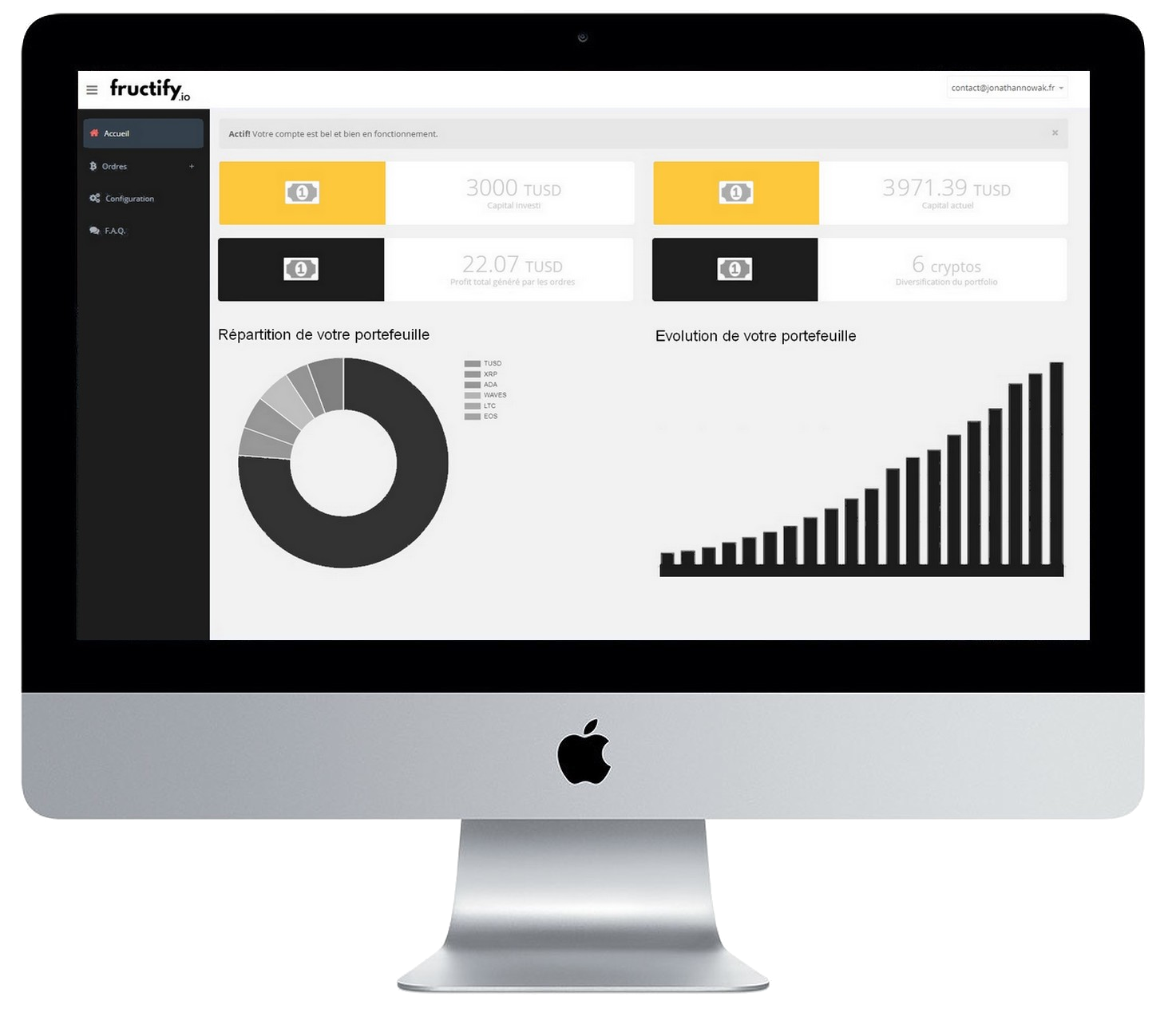 * Avertissement : Tout investissement comporte un risque. Vous pouvez perdre tout ou partie de votre capital. L'investissement est accompagné d’un niveau élevé de risques ne convenant pas à de nombreux investisseurs. Aucun gain ne sont garanti. Vous ne devez pas investir d’argent que vous ne pouvez vous permettre de perdre. Les performances passées ne présagent en rien des performances futures. Il existe un risque inhérent aux investissements sur un marché non réglementé. Vous reconnaissez, en utilisant et/ou en continuant à utiliser le service « Fructify.io », avoir lu, compris et accepté les CGV/CGU. En tout état de cause, l’Utilisateur est parfaitement conscient et averti des risques que comportent le trading et l’investissement. La Société FRUCTIFY ne pourra pas, dès lors, être tenue responsable des pertes subies par l’Utilisateur de quelque nature qu’il soit.